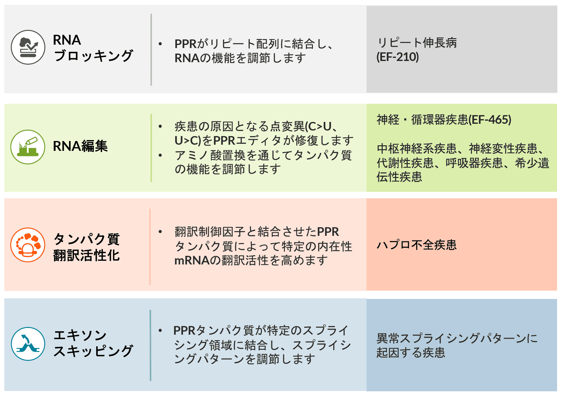 さまざまな作用機序(MOA)と標的可能なRNA関連疾患